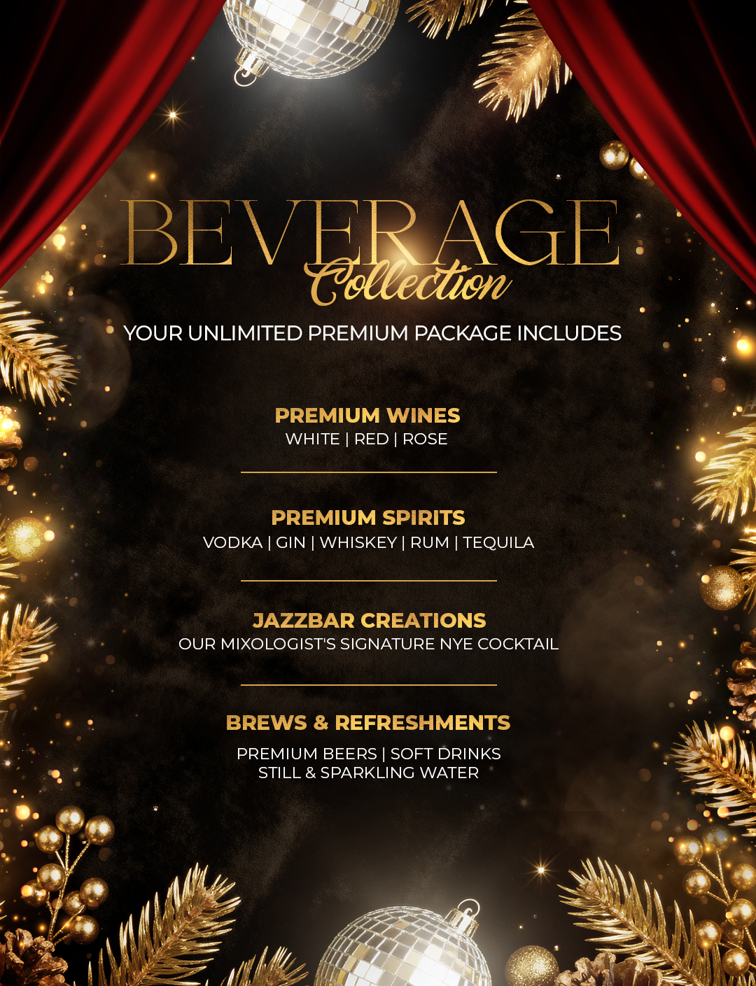 This is where New Year’s Eve unfolds in full color. A seamless flow of premium drinks, the warmth of live music, the thrill of the midnight toast, and the late-night rhythm of our resident DJ. The Bar Package is a celebration built to last effortless, vibrant, and made for those who want to feel the night stretch beyond midnight.